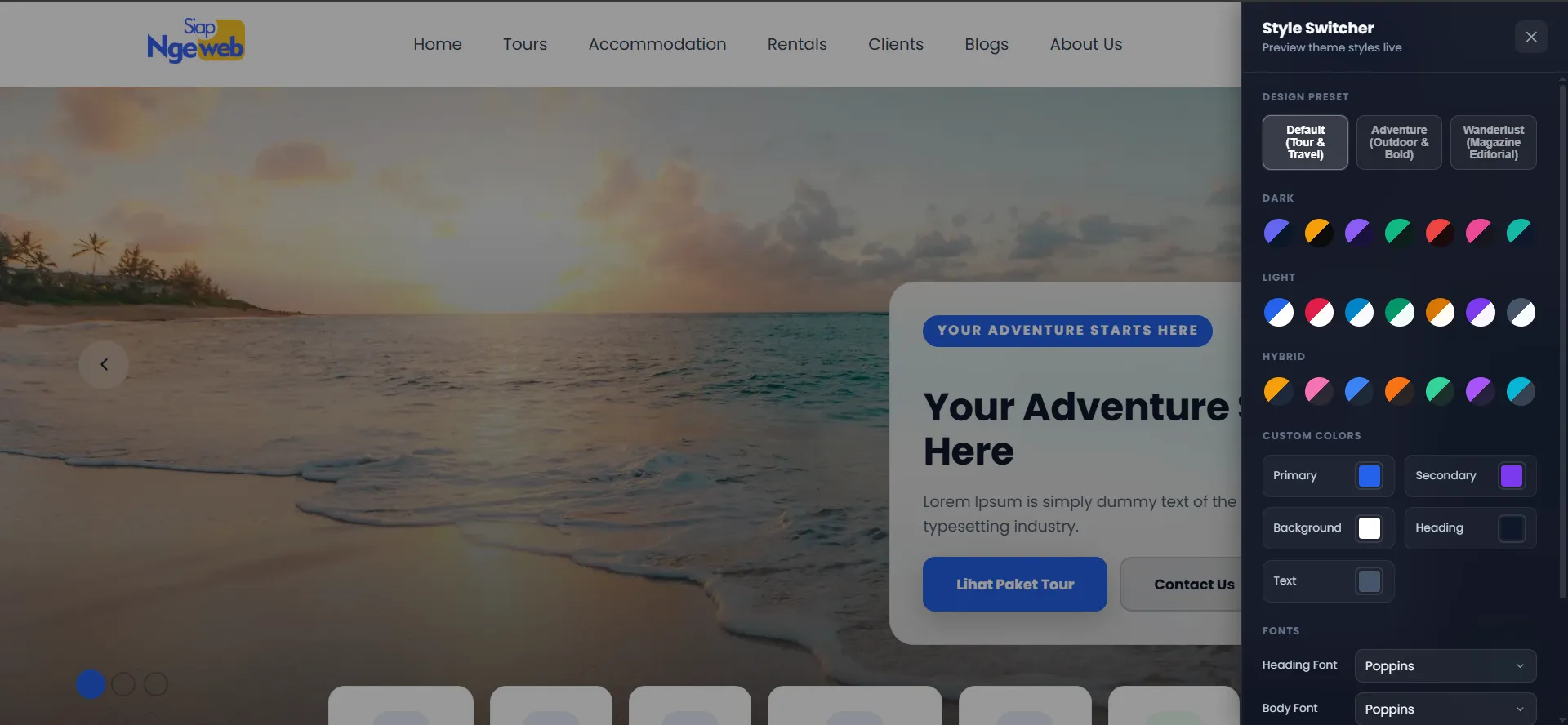 Anda bisa mengganti seluruh tampilan warna website hanya dengan satu klik — tersedia 21 kombinasi warna yang sudah dirancang profesional. Atau jika ingin lebih personal, Anda bisa atur warna satu per satu (warna utama, latar belakang, teks, header, footer, tombol, dan lainnya) melalui menu pengaturan di dashboard.