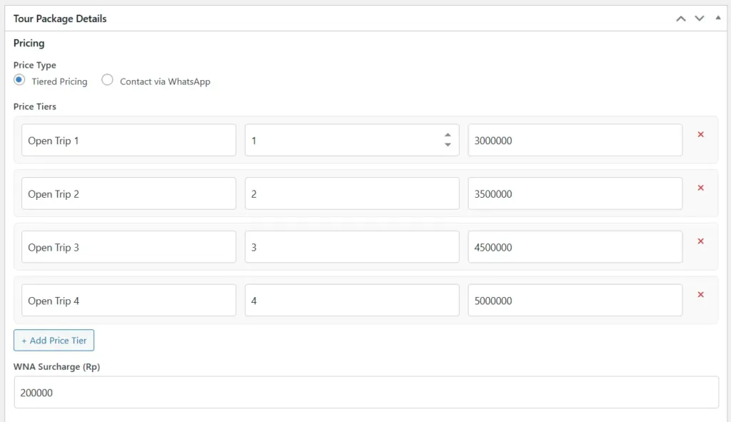 Untuk harga, Anda punya tiga pilihan sistem. Pertama, harga bertingkat — misalnya paket “Standard” Rp 2 juta, “Premium” Rp 3,5 juta, dan “VIP” Rp 5 juta. Pengunjung tinggal pilih mana yang cocok. Kedua, harga tetap untuk semua peserta. Ketiga, mode “Hubungi Kami” yang mengarahkan calon pelanggan langsung ke WhatsApp untuk negosiasi.
