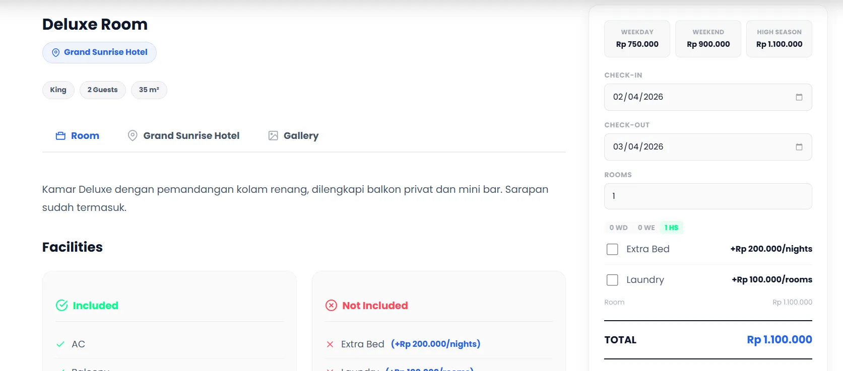 Ada juga fitur tambahan (add-on) yang bisa Anda tawarkan — misalnya sarapan, antar-jemput bandara, atau extra bed. Setiap add-on bisa Anda atur cara hitungnya: per kamar, per malam, per orang, atau per orang per malam. Semua ini dikalkulasi otomatis oleh website dan ditampilkan langsung ke calon tamu sebelum mereka kirim booking.