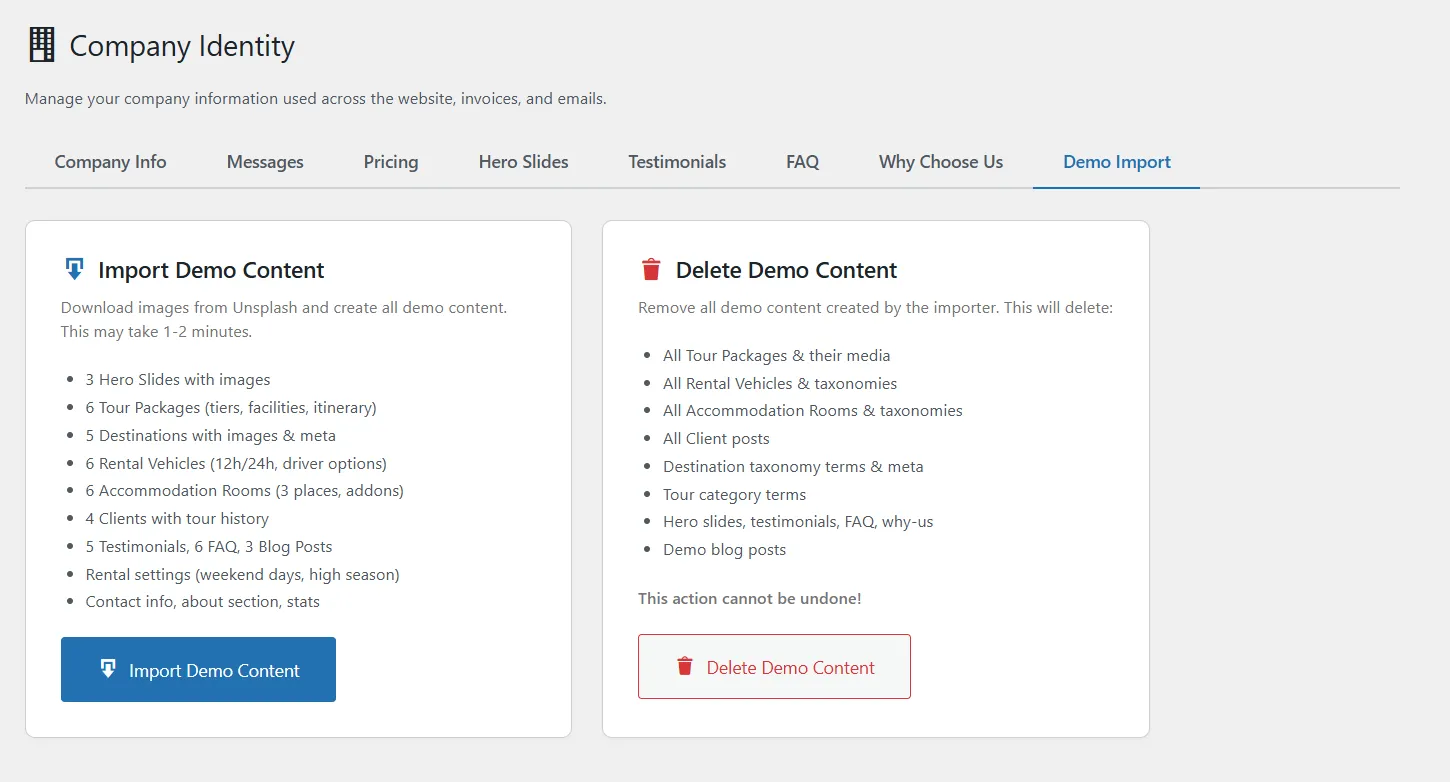 Tidak perlu bingung mengisi website dari nol. Cukup klik satu tombol “Import Demo”, website langsung terisi contoh paket wisata, penginapan, kendaraan, artikel blog, dan semua pengaturan — siap digunakan. Tinggal ganti konten contoh dengan konten asli bisnis Anda.