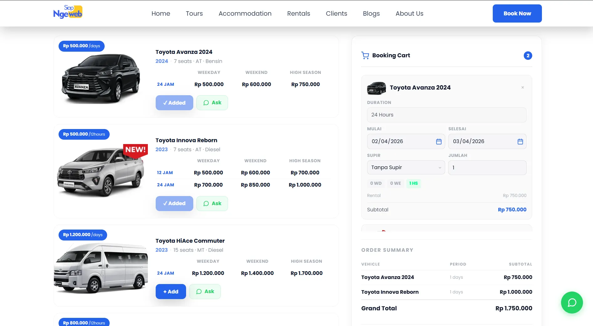 Yang membedakan dari website travel biasa: pengunjung bisa menambahkan beberapa kendaraan sekaligus ke dalam satu keranjang booking. Misalnya satu minibus untuk rombongan utama dan satu sedan untuk panitia — semuanya di-booking dalam satu formulir, satu kali kirim, satu invoice.