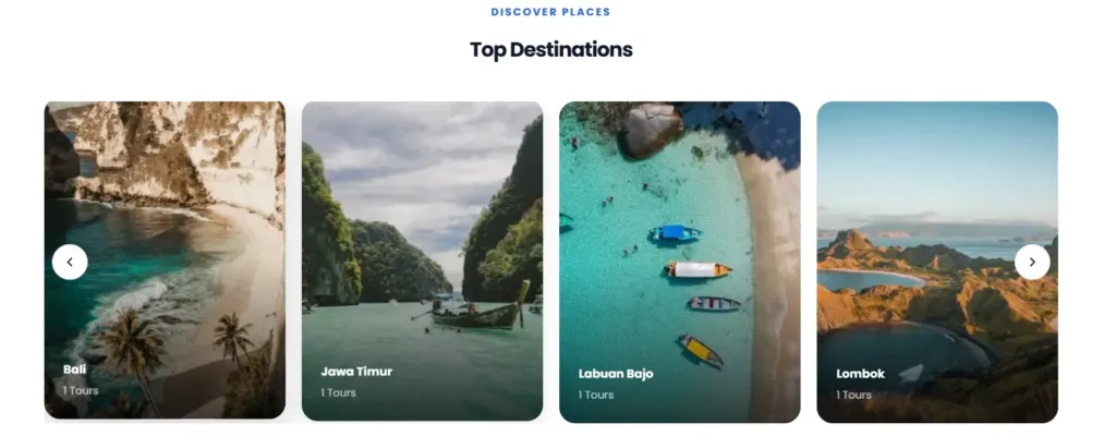 Destinasi juga tampil di halaman utama sebagai kartu visual yang mengundang klik, membuat pengunjung langsung tertarik menjelajahi pilihan wisata Anda.