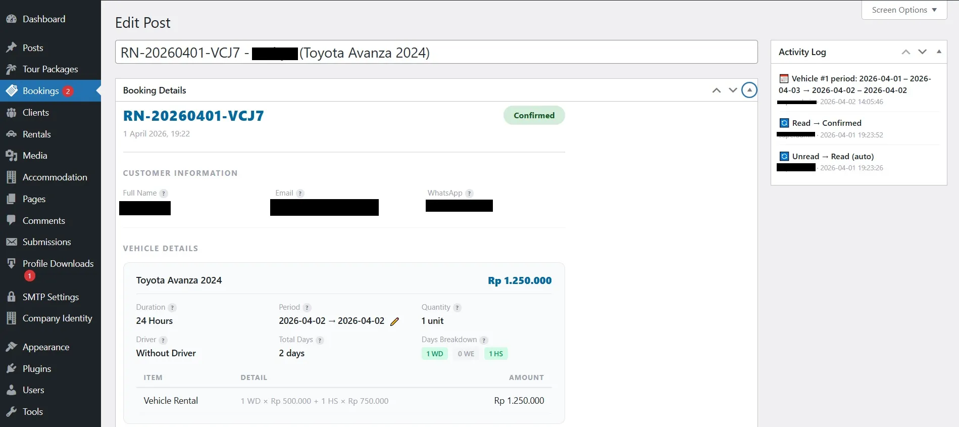 Setiap booking yang masuk — baik itu paket wisata, penginapan, maupun kendaraan — masuk ke satu halaman “Bookings” di dashboard WordPress Anda. Di sini Anda bisa melihat semua pesanan, memfilter berdasarkan status atau tipe booking, dan membuka detail lengkap setiap pesanan.